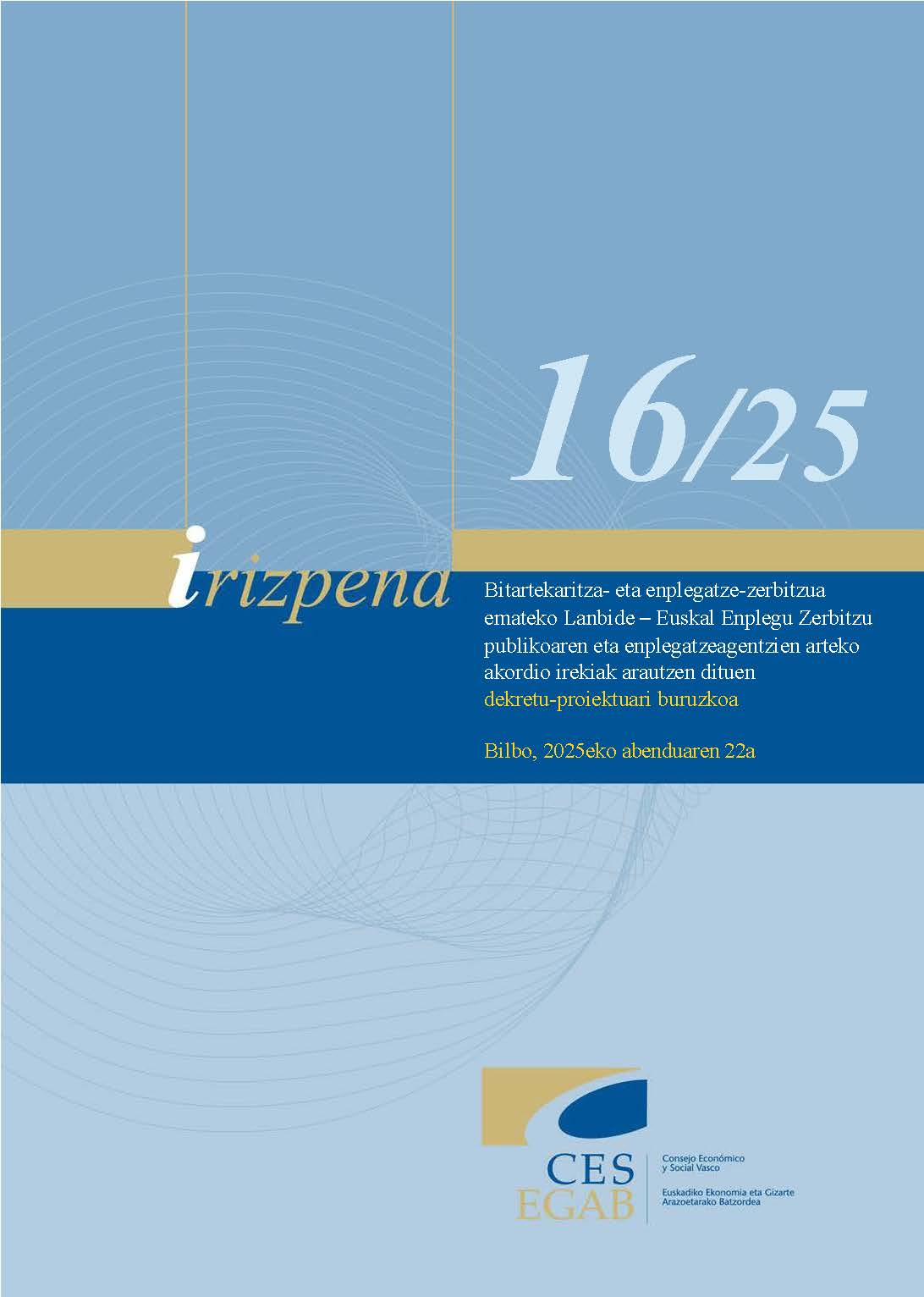 16/25 IRIZPENA ABENDUAREN 22KOA, BITARTEKARITZA- ETA ENPLEGATZE-ZERBITZUA EMATEKO LANBIDE – EUSKAL ENPLEGU ZERBITZU PUBLIKOAREN ETA ENPLEGATZEAGENTZIEN ARTEKO AKORDIO IREKIAK ARAUTZEN DITUEN DEKRETU-PROIEKTUARI BURUZKOA